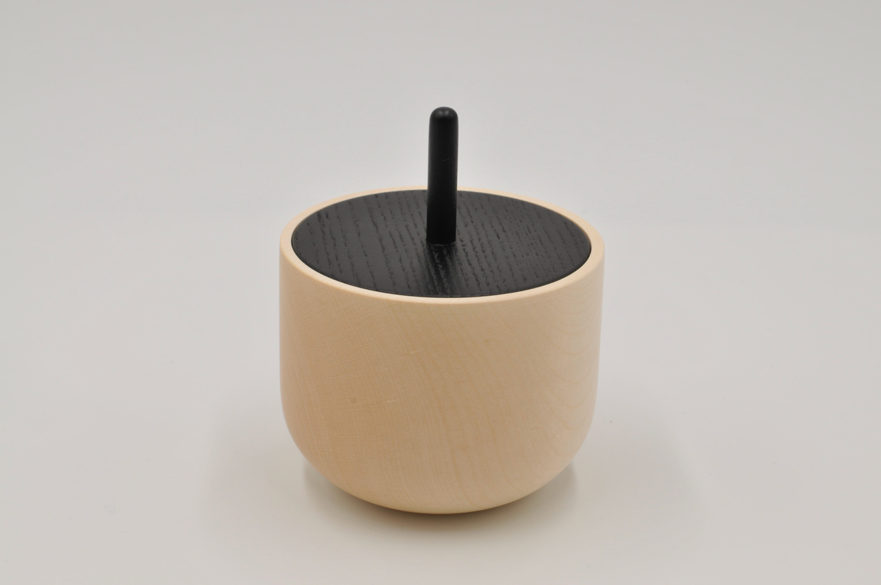 Bowl made of solid maple wood, untreated and finely sanded. Lid made of solid ash wood, lightly brushed and coloured lacquered.