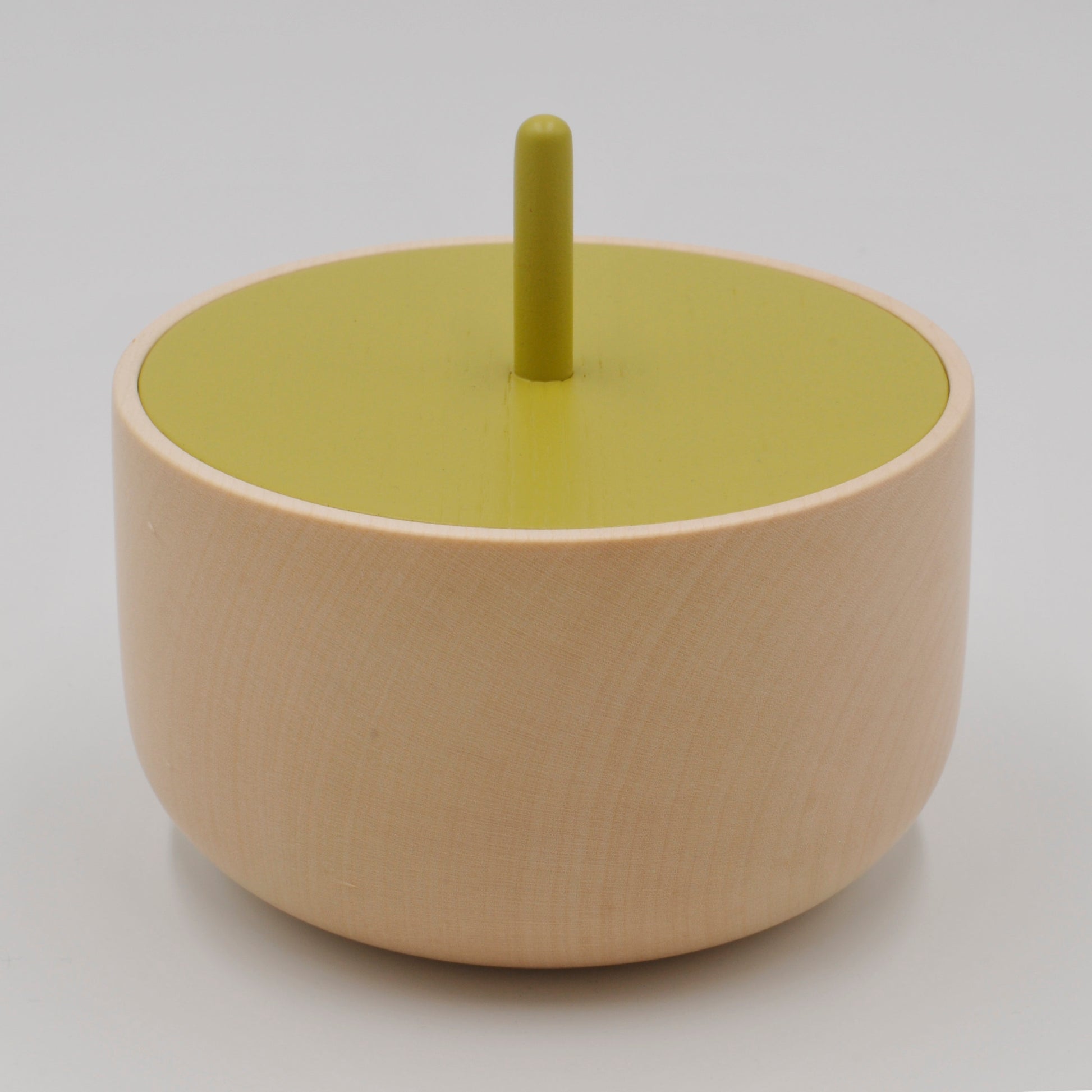 Zuccheriera in legno massello di acero non trattato e finemente levigato. Coperchio in legno massello di frassino, leggermente spazzolato e verniciato a colori.